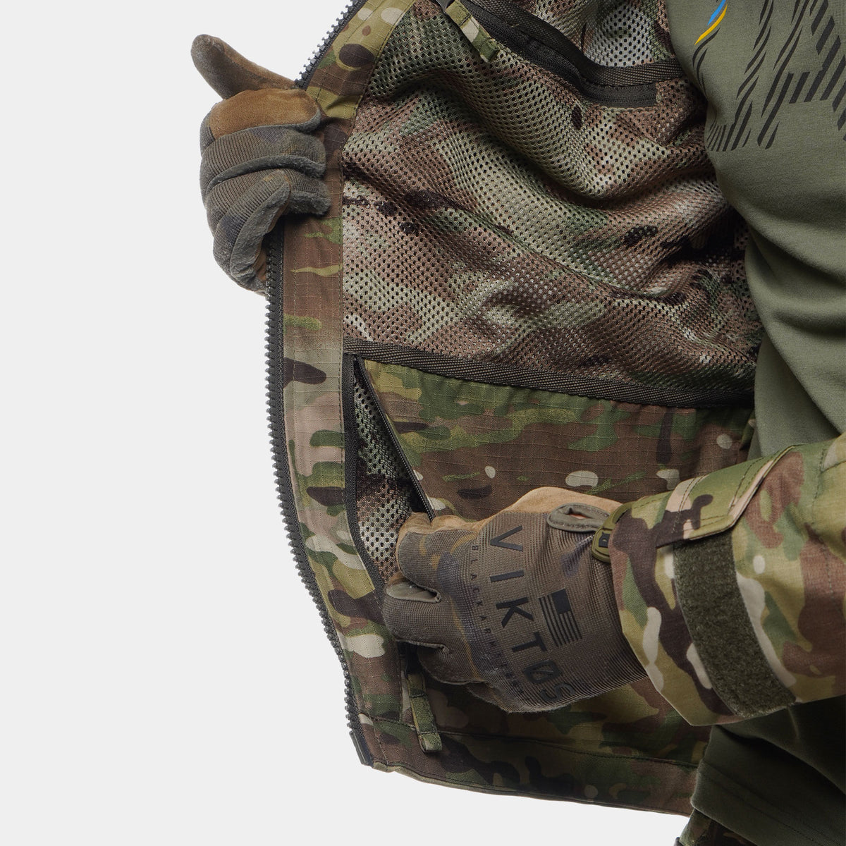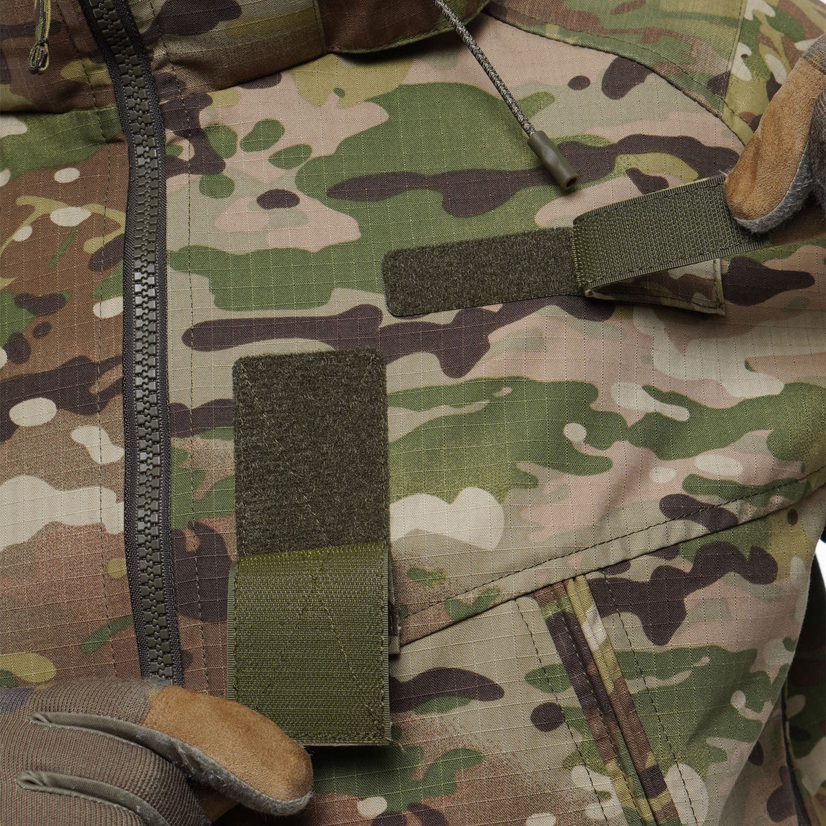- four internal pockets - two for documents, and two with quick access from the bottom of the jacket; Chest areas with Velcro for attaching patches Sleeve areas for attaching chevrons High-quality YKK® zippers Side ventilation holes with mesh Cuff regulators with velcro Removable hood with adjustments in two planes for greater convenience Wind- and Water-repellent face material Ripstop Reinforcement CORDURA® 500d MultiCam Brookwood® USA in the area of elbows, shoulders, waist and lower back Two-way waist adjustment with drawstrings