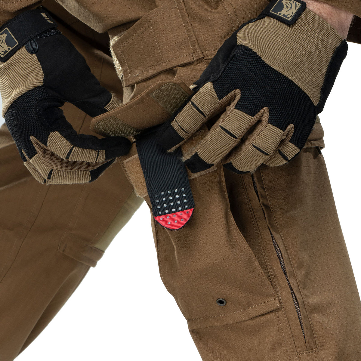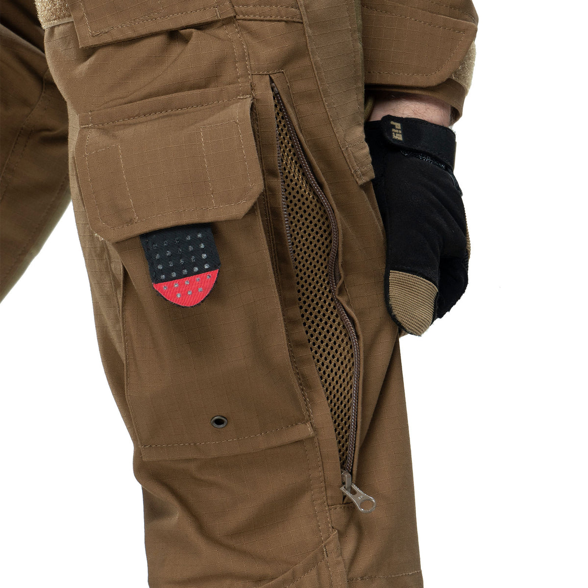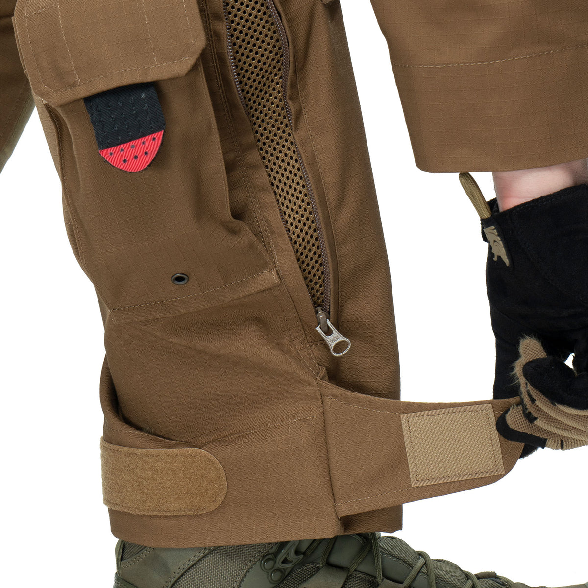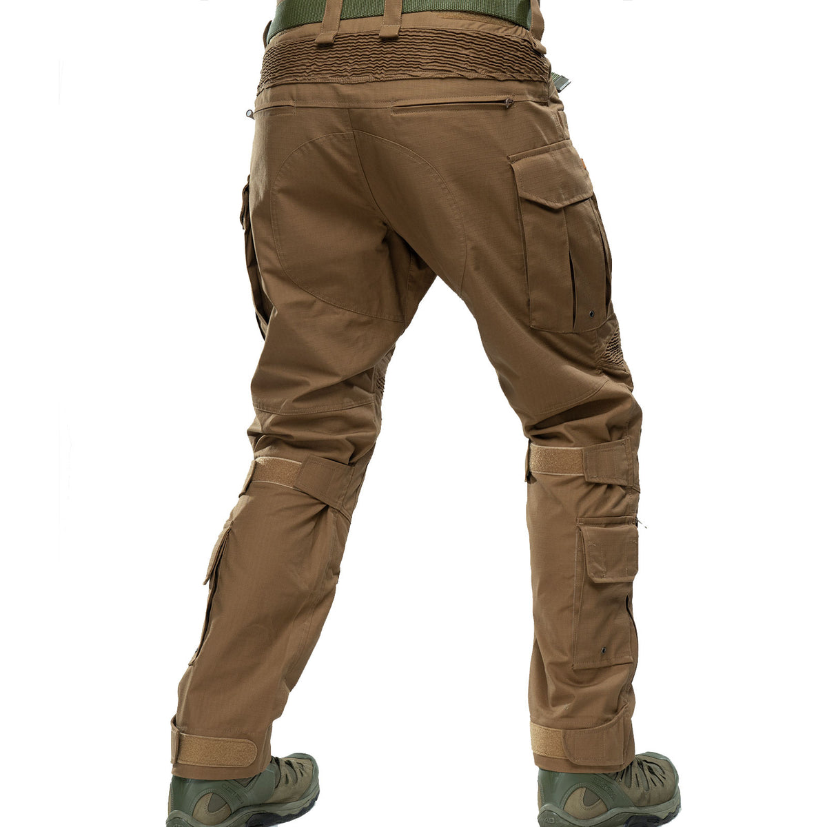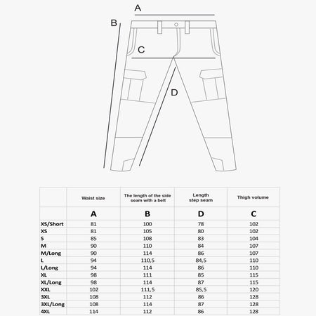 For convenient use, the pants are equipped with 11 pockets - two pockets in the front and two pockets in the back, 2 large cargo pockets (Left - equipped with two stabilizing elastics for fixing a water bottle or magazine and a carabiner; Right - equipped with two mesh compartments), two front pockets with adjustments the height of the knee pad inside, two pockets for small things in the lower part, a pocket for a knife on the right side.