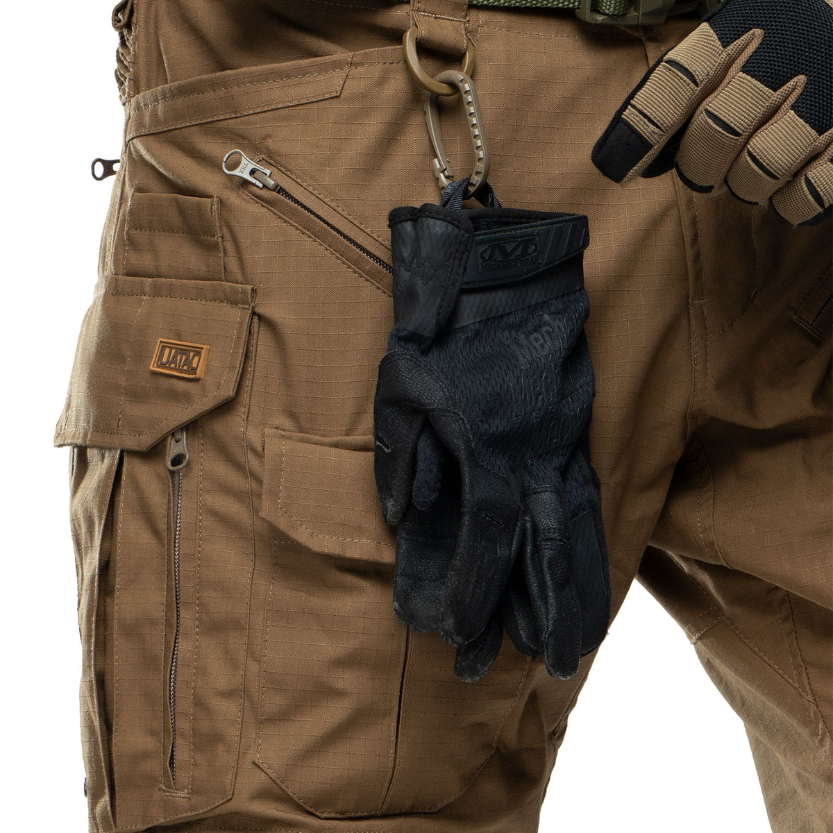 2 carabiners on the front of the pants and in the left cargo pocket
