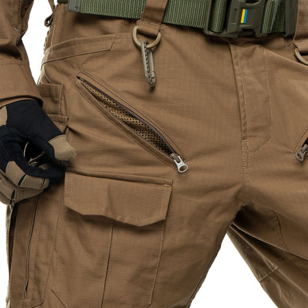 The fabric consists of 65% cotton and 35% polyester, which makes it pleasant to the touch and resistant to tearing and damage. Ripstop weaving and German reinforced threads will prevent the pants from tearing even under heavy loads. Equipped with two ventilation zones for improved thermoregulation.
