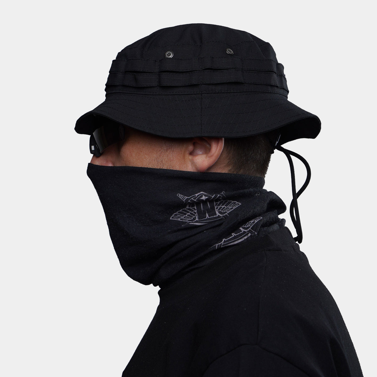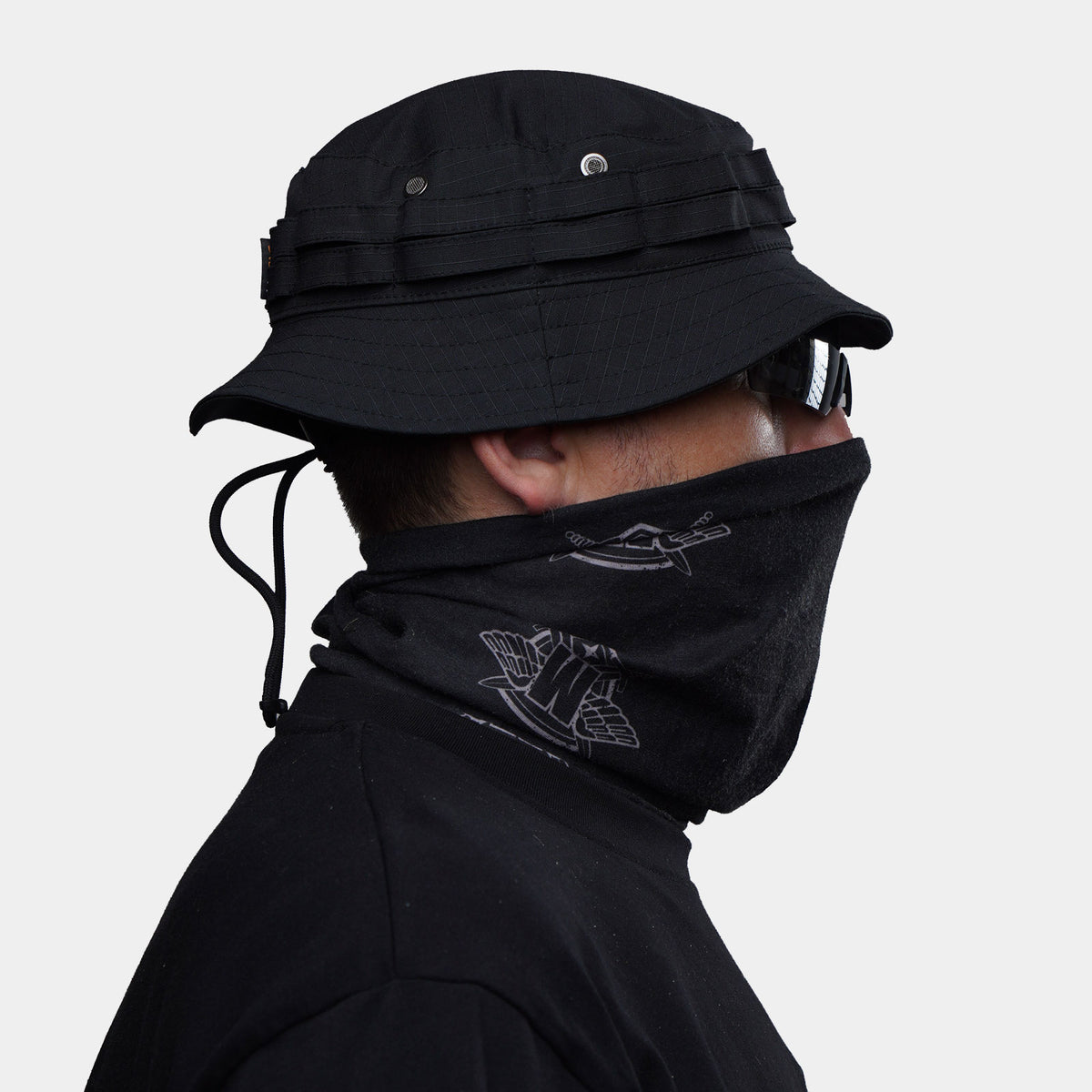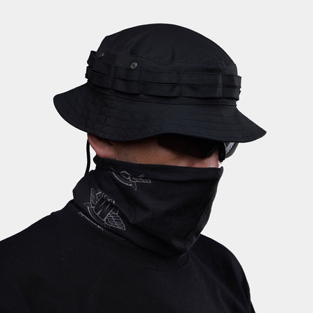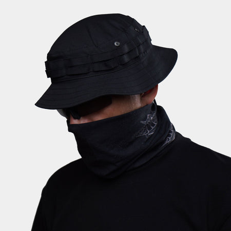 Panama hat from the UATAC brand in color Black Flexible. It has a cut with semi-rigid brims. The brim has a tape sewn around the perimeter, which is designed to attach additional camouflage equipment. It is equipped with a special cord that will not allow the panama hat to fly off the head during strong gusts of wind. It also has two built-in eyelets on each side, which provide excellent ventilation. The panama hat is sewn from durable and high-quality rip-stop fabric. All seams are hidden from the inside. This method of processing the seams makes the panama hat more comfortable during prolonged wear, and also increases its resistance to wear.