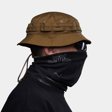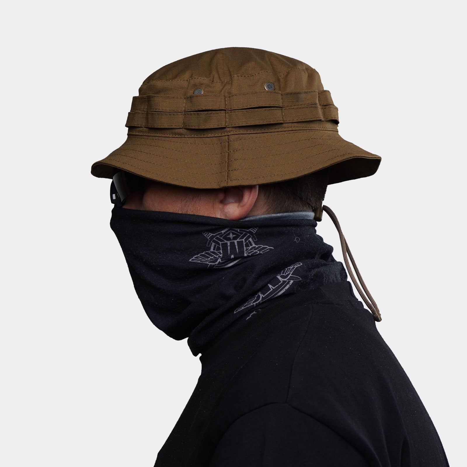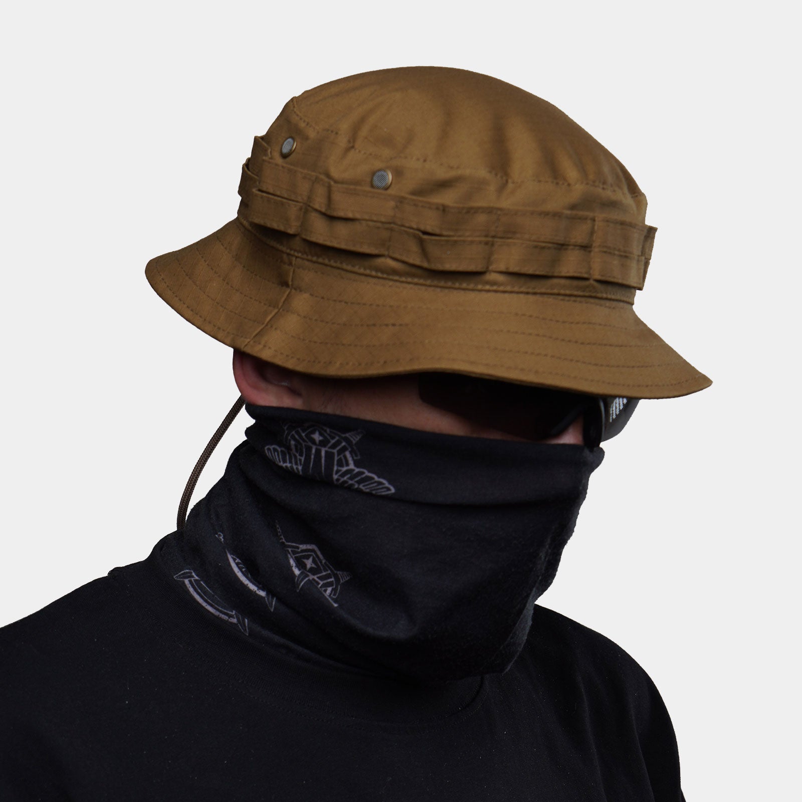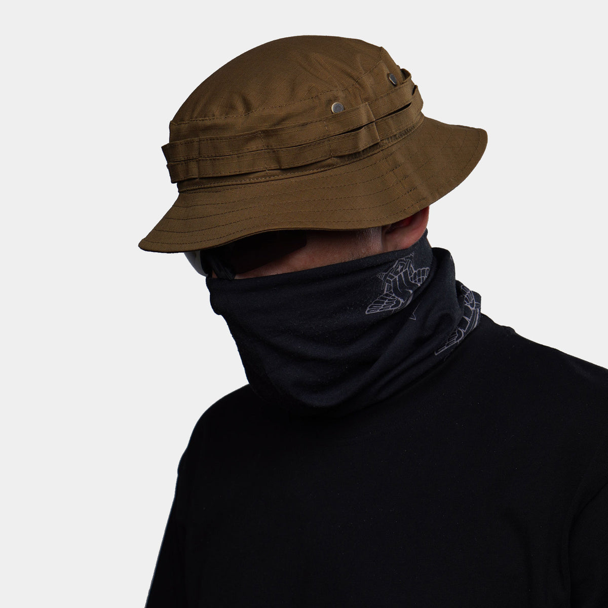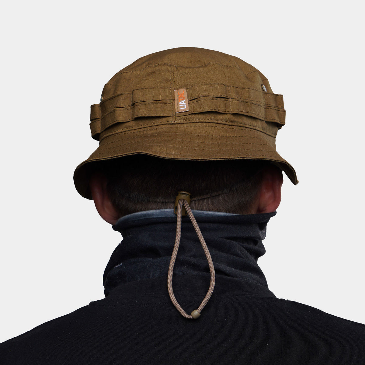 Panama hat from the UATAC brand in color Coyote Flexible. It has a cut with semi-rigid brims. The brim has a tape sewn around the perimeter, which is designed to attach additional camouflage equipment. It is equipped with a special cord that will not allow the panama hat to fly off the head during strong gusts of wind. It also has two built-in eyelets on each side, which provide excellent ventilation. The panama hat is sewn from durable and high-quality rip-stop fabric. All seams are hidden from the inside. This method of processing the seams makes the panama hat more comfortable during prolonged wear, and also increases its resistance to wear.