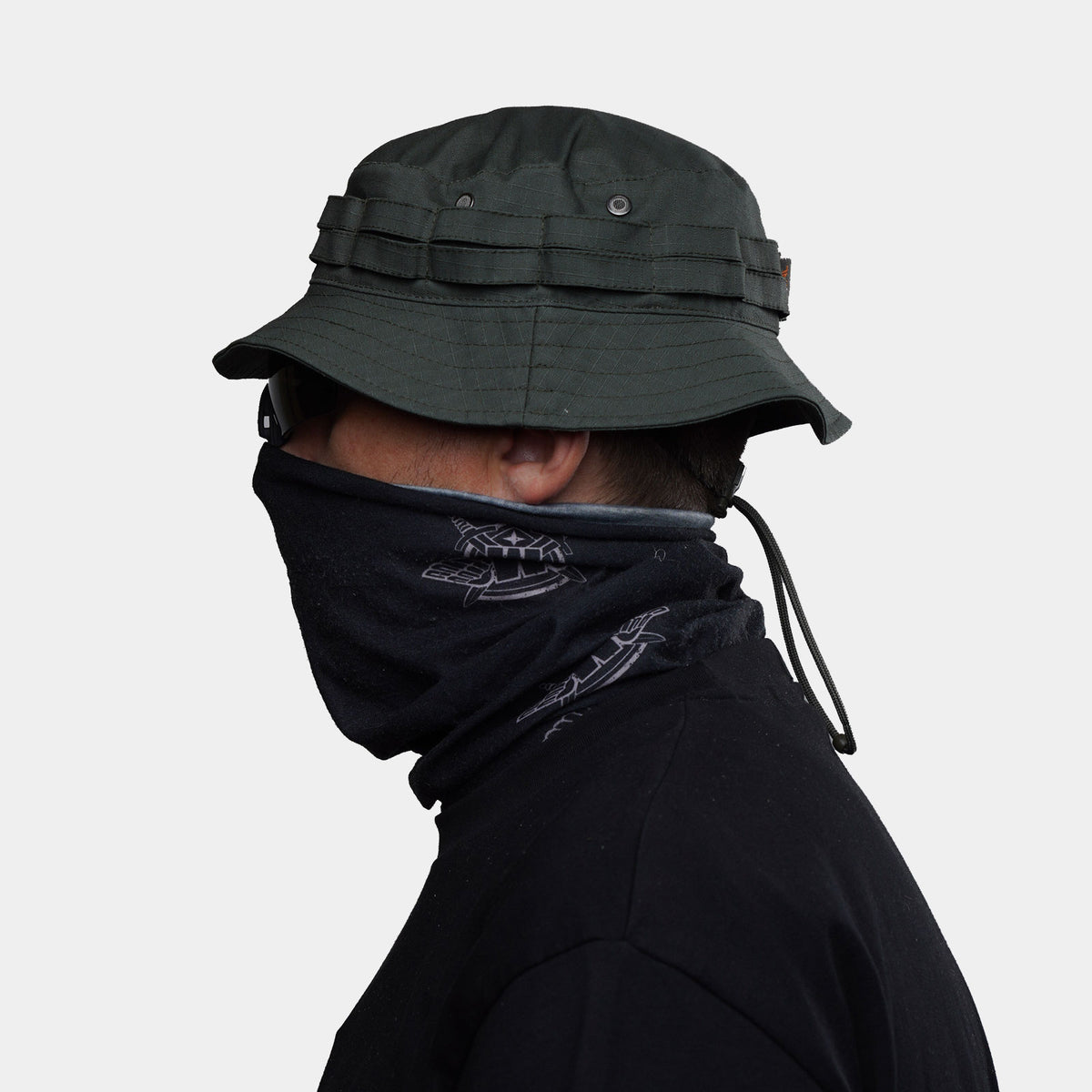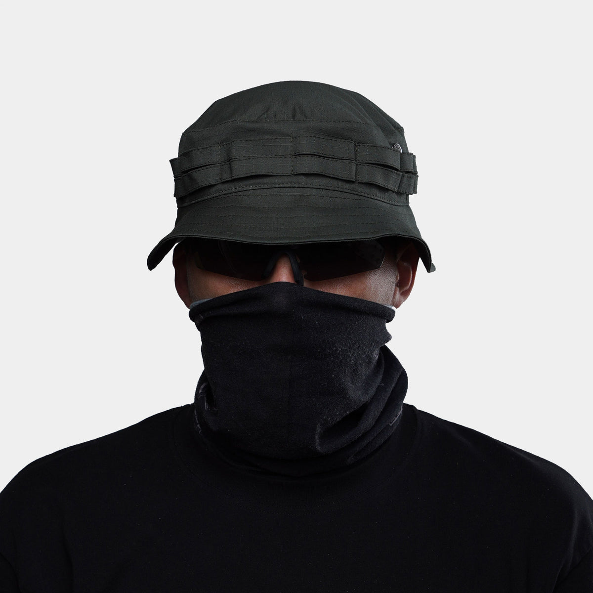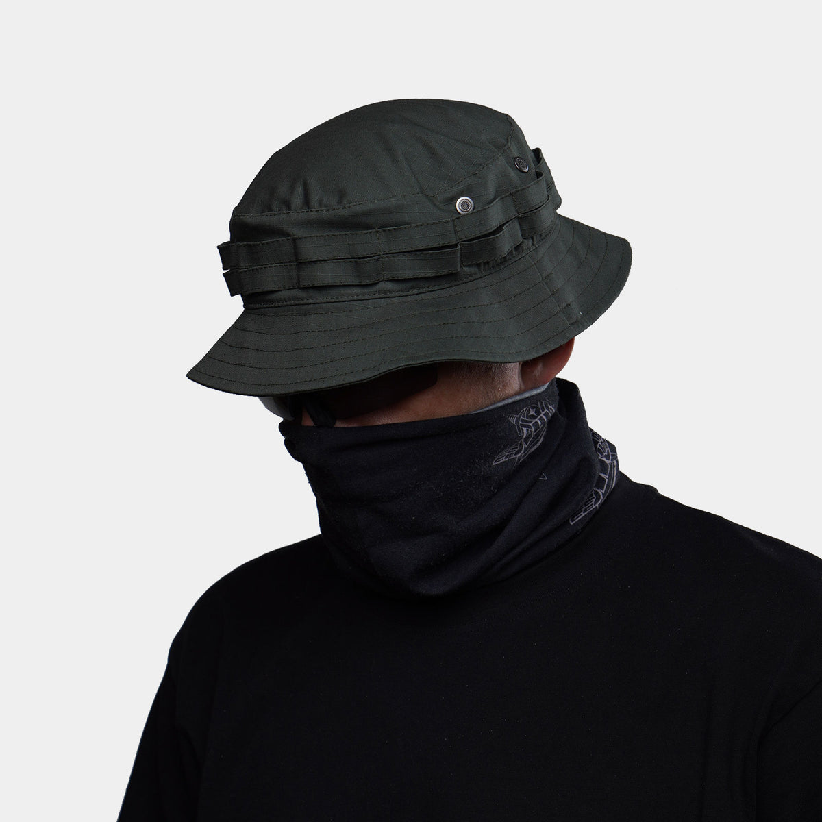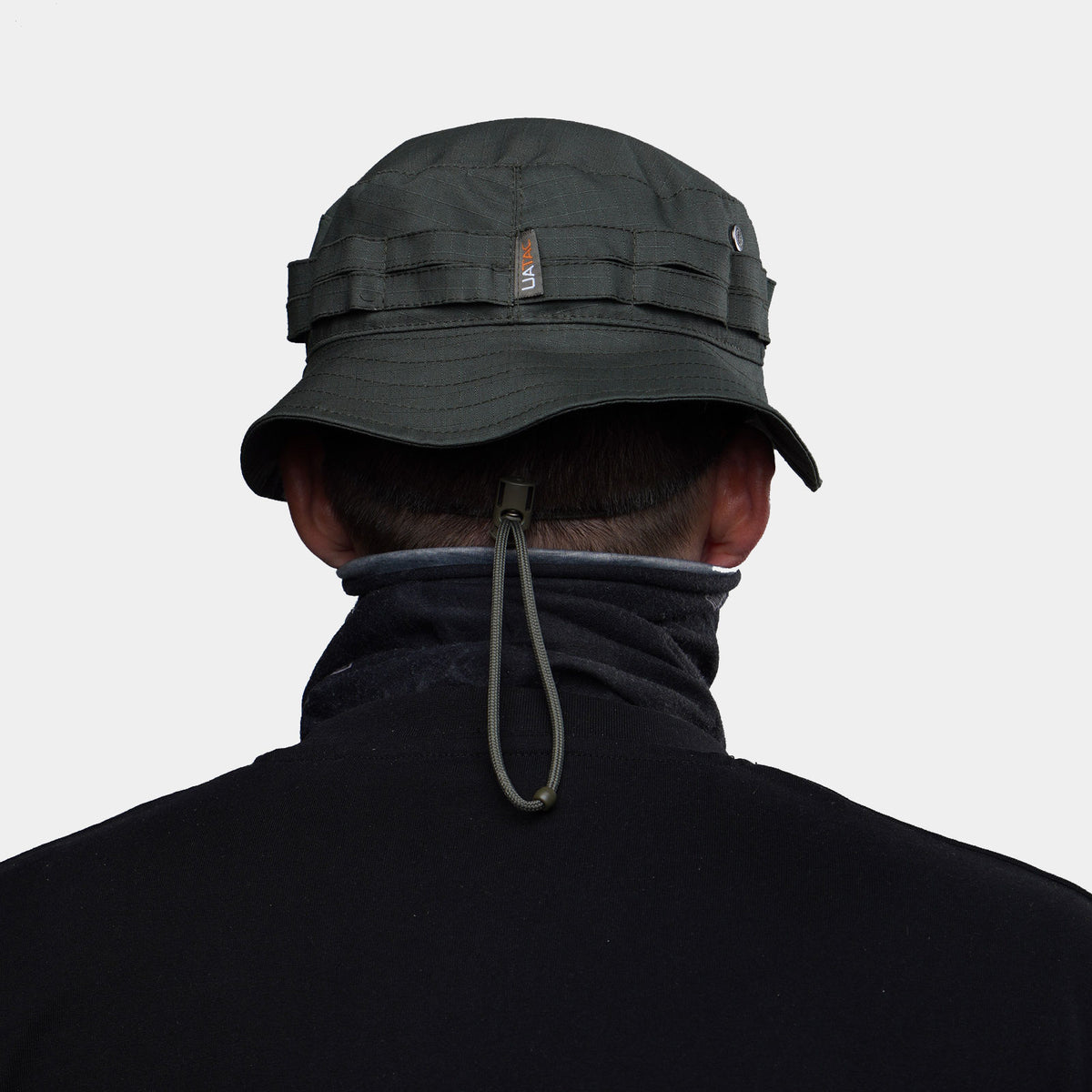 Panama hat from the UATAC brand in color Olive Flexible. It has a cut with semi-rigid brims. The brim has a tape sewn around the perimeter, which is designed to attach additional camouflage equipment. It is equipped with a special cord that will not allow the panama hat to fly off the head during strong gusts of wind. It also has two built-in eyelets on each side, which provide excellent ventilation. The panama hat is sewn from durable and high-quality rip-stop fabric. All seams are hidden from the inside. This method of processing the seams makes the panama hat more comfortable during prolonged wear, and also increases its resistance to wear.