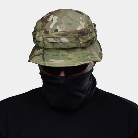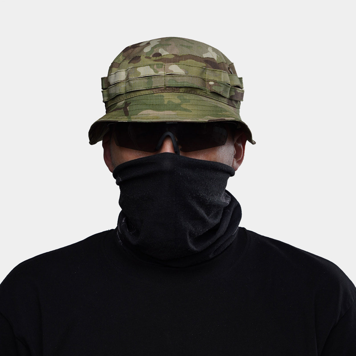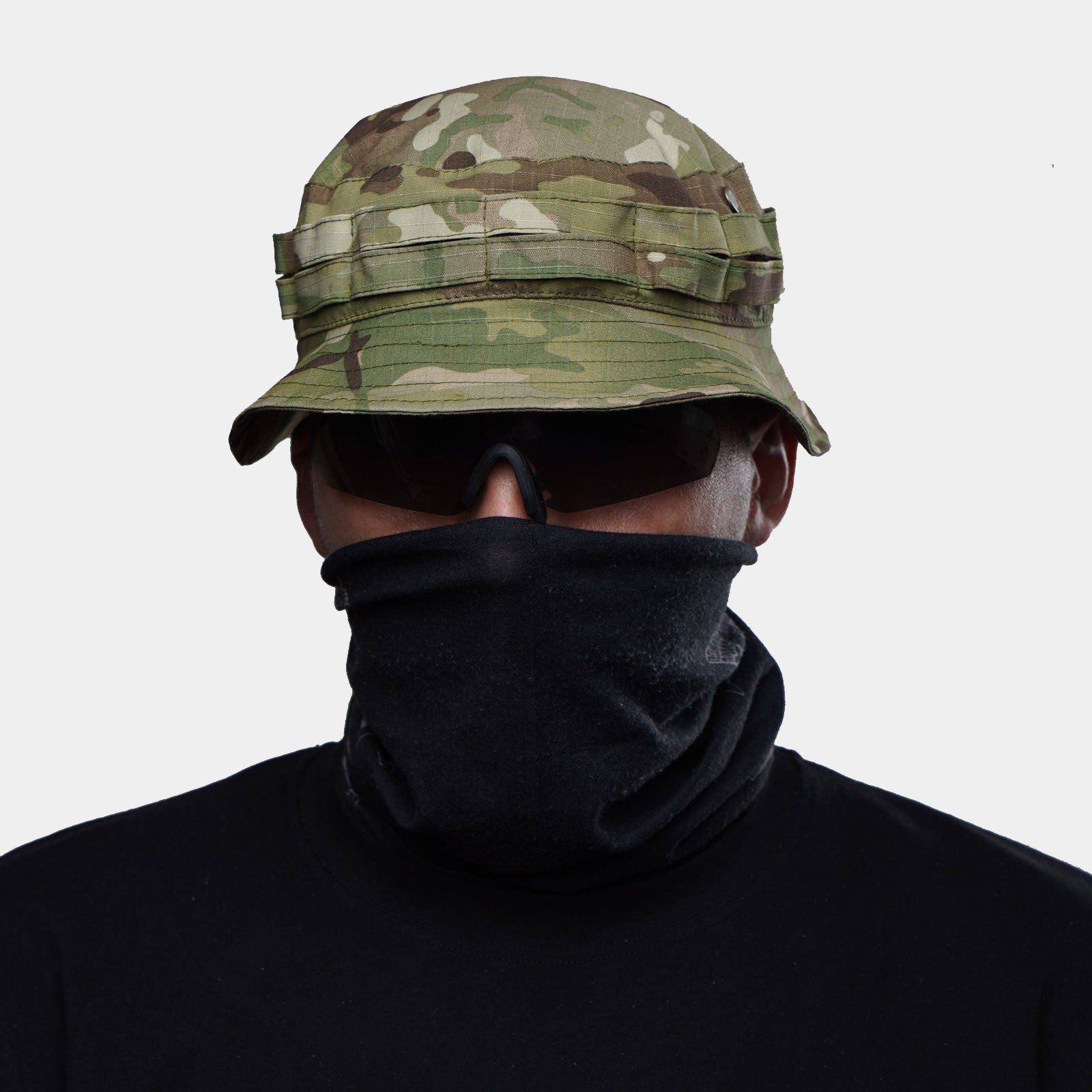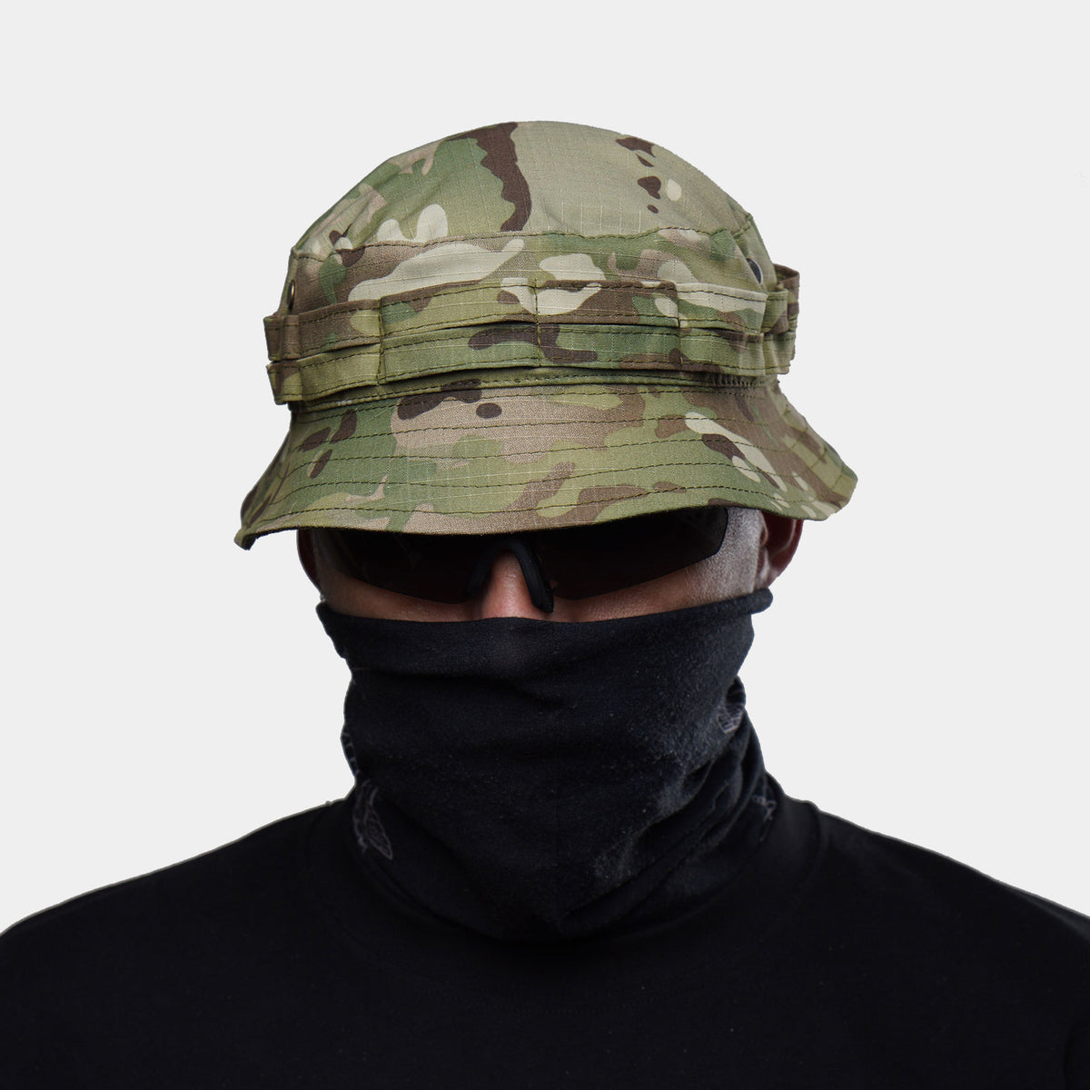 Panama hat from the UATAC brand with mowed fields in color Multicam Flexible. It has a cut with semi-rigid brims. The brim has a tape sewn around the perimeter, which is designed to attach additional camouflage equipment. It is equipped with a special cord that will not allow the panama hat to fly off the head during strong gusts of wind. It also has two built-in eyelets on each side, which provide excellent ventilation. The panama hat is sewn from durable and high-quality rip-stop fabric. All seams are hidden from the inside. This method of processing the seams makes the panama hat more comfortable during prolonged wear, and also increases its resistance to wear.