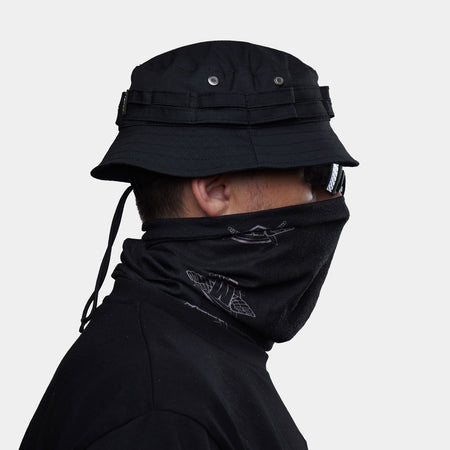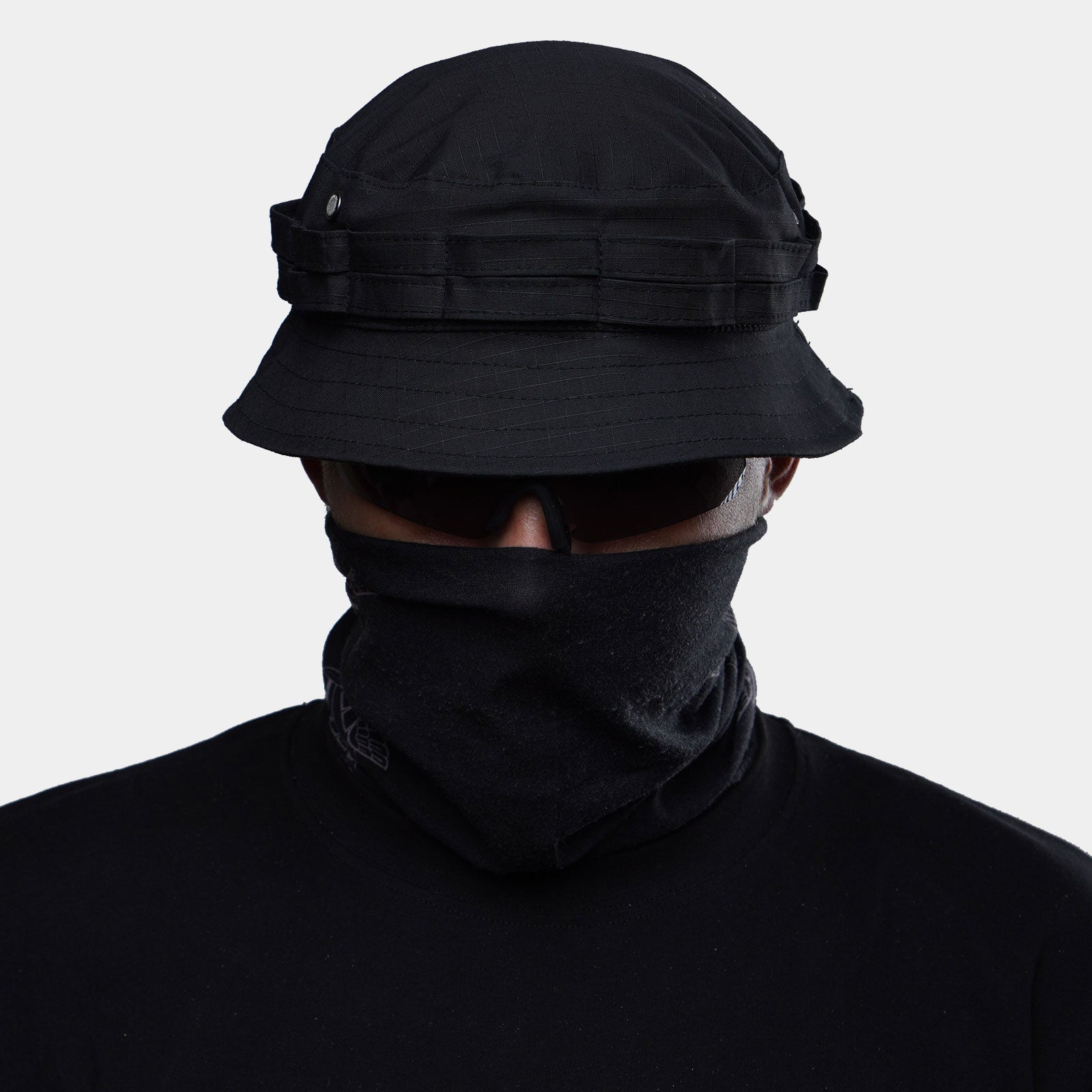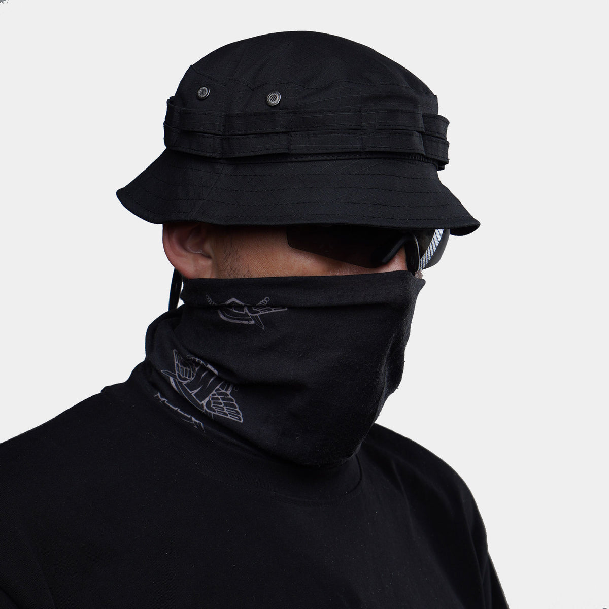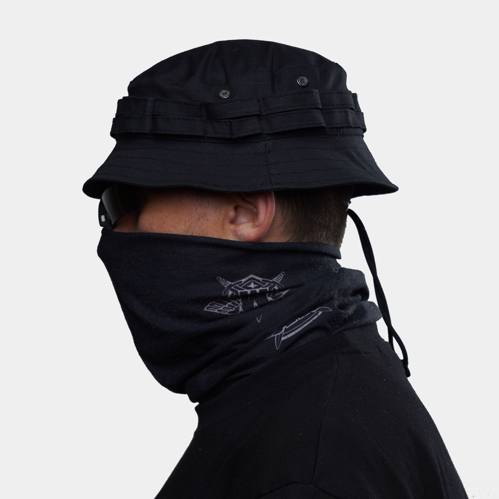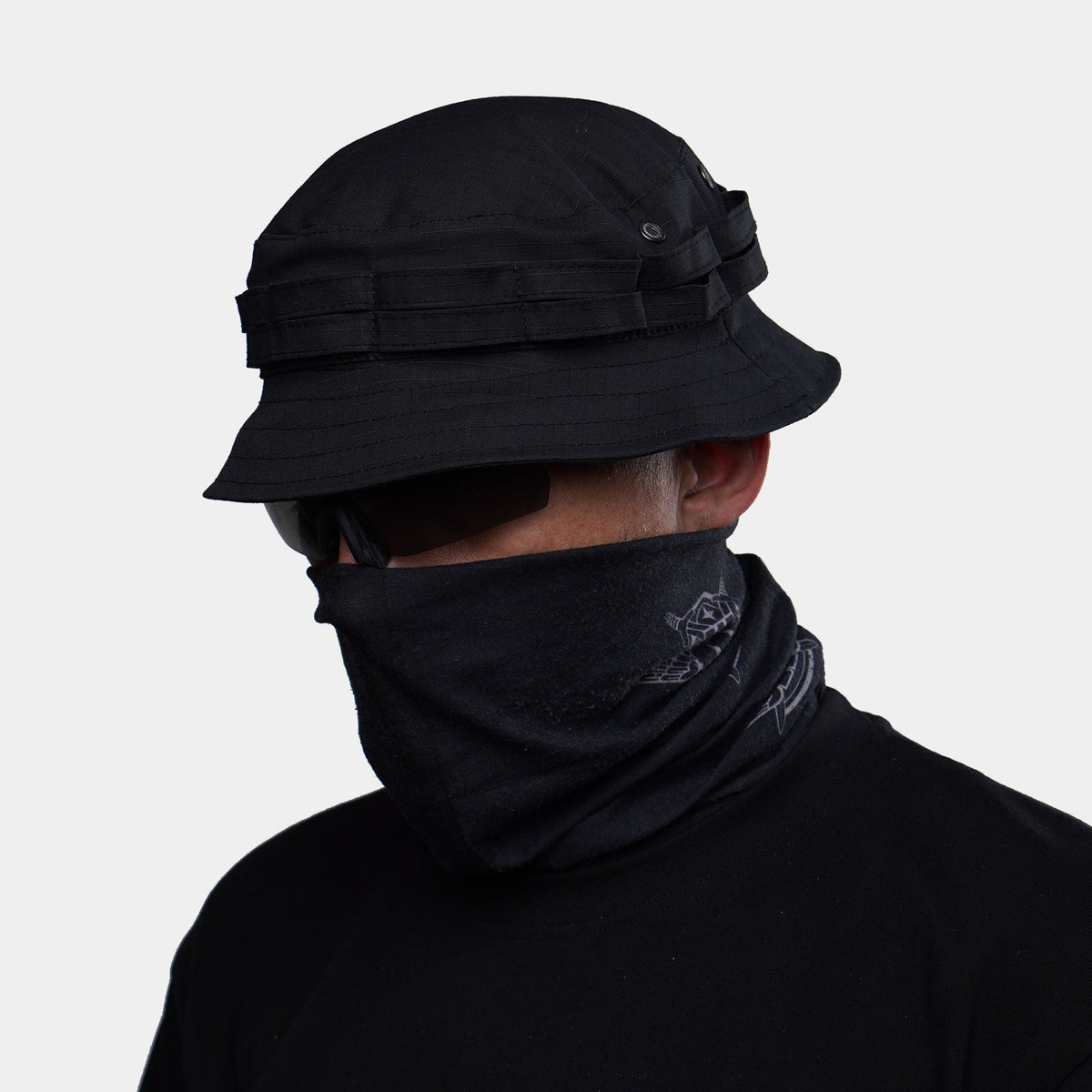 Panama hat from the UATAC brand with mowed fields in color Black Flexible. It has a cut with semi-rigid brims. The brim has a tape sewn around the perimeter, which is designed to attach additional camouflage equipment. It is equipped with a special cord that will not allow the panama hat to fly off the head during strong gusts of wind. It also has two built-in eyelets on each side, which provide excellent ventilation. The panama hat is sewn from durable and high-quality rip-stop fabric. All seams are hidden from the inside. This method of processing the seams makes the panama hat more comfortable during prolonged wear, and also increases its resistance to wear.
