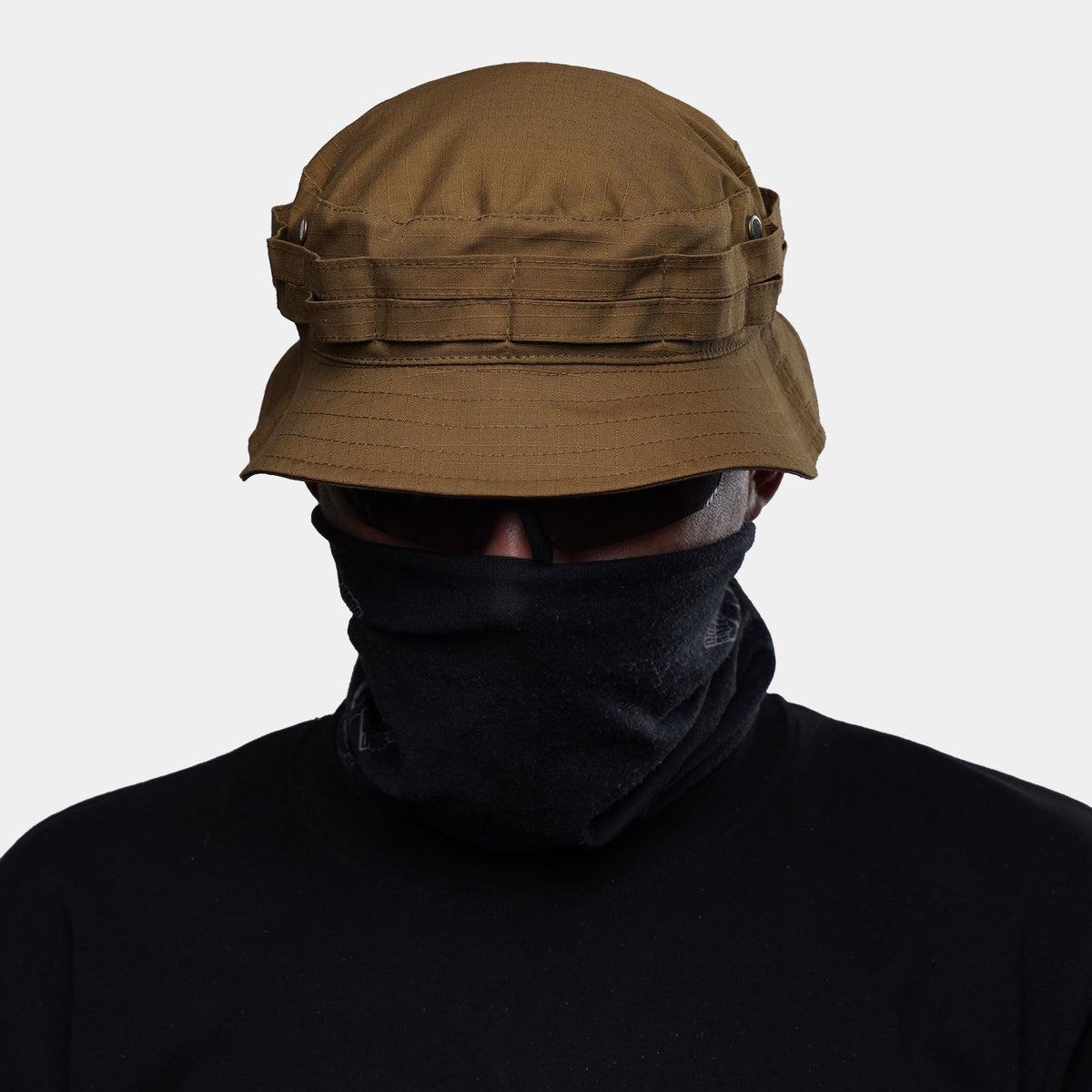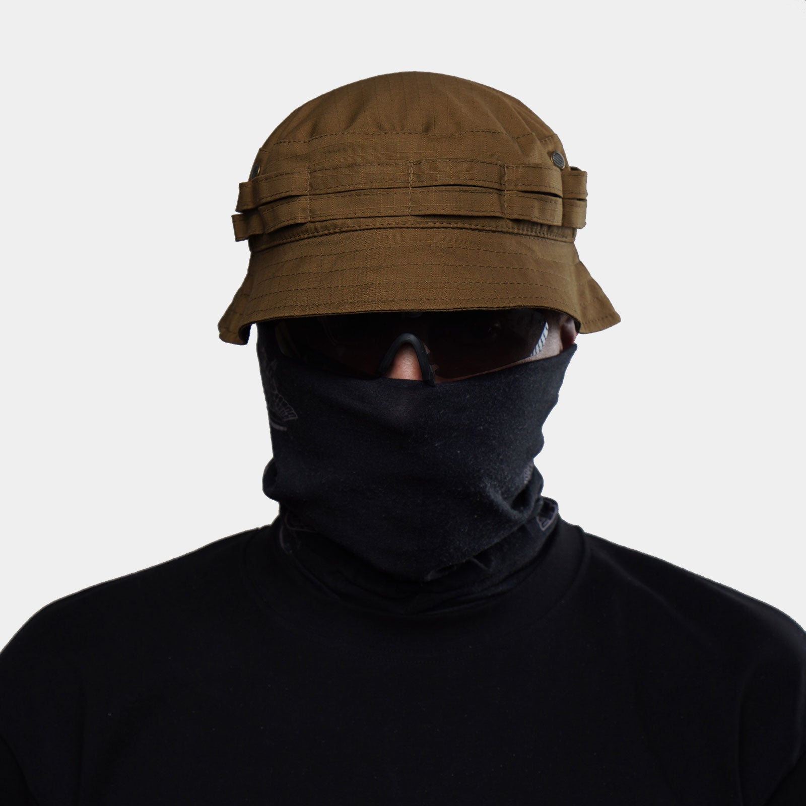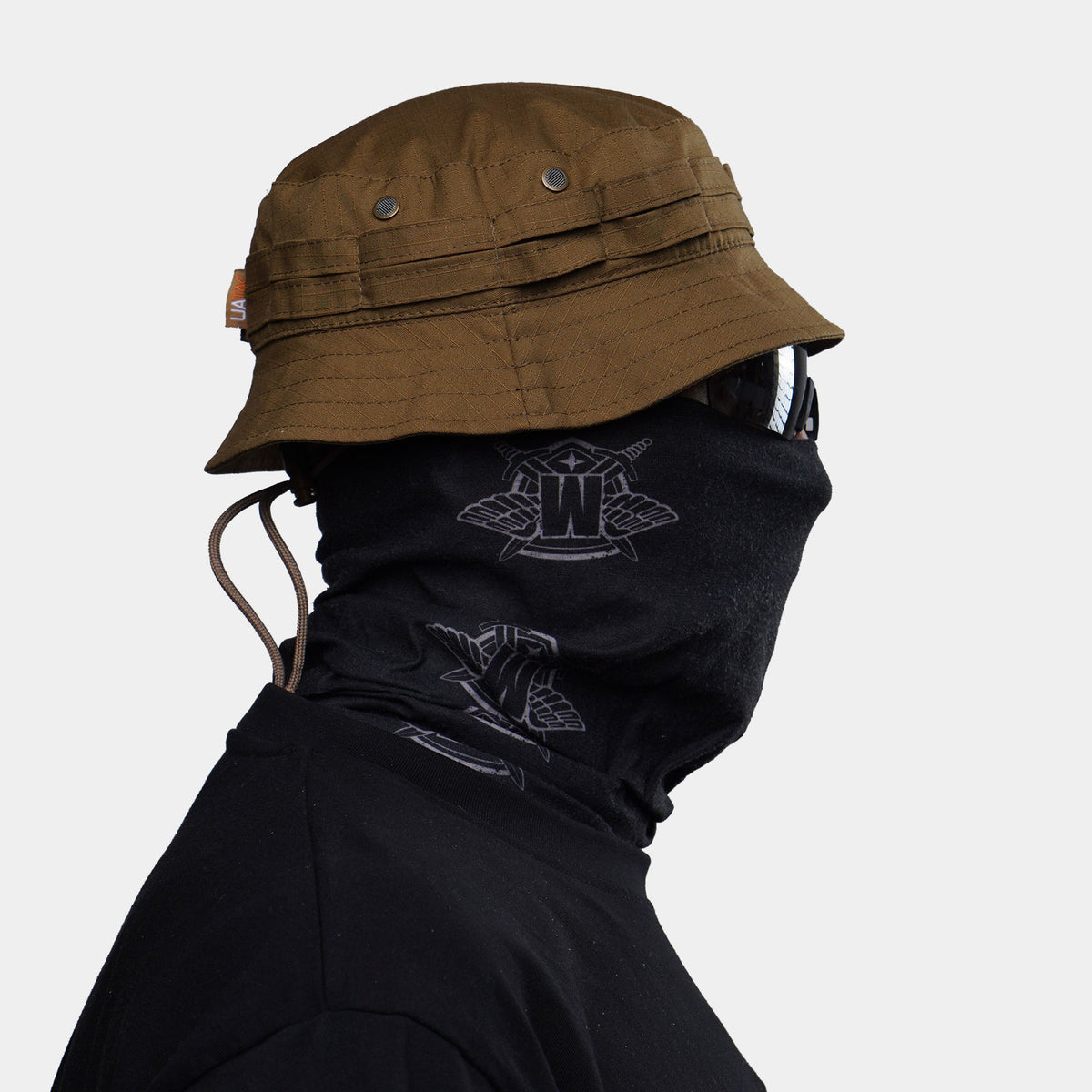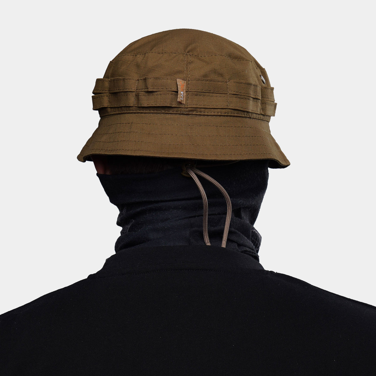 Panama hat from the UATAC brand with mowed fields in color Coyote Flexible. It has a cut with semi-rigid brims. The brim has a tape sewn around the perimeter, which is designed to attach additional camouflage equipment. It is equipped with a special cord that will not allow the panama hat to fly off the head during strong gusts of wind. It also has two built-in eyelets on each side, which provide excellent ventilation. The panama hat is sewn from durable and high-quality rip-stop fabric. All seams are hidden from the inside. This method of processing the seams makes the panama hat more comfortable during prolonged wear, and also increases its resistance to wear.