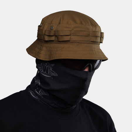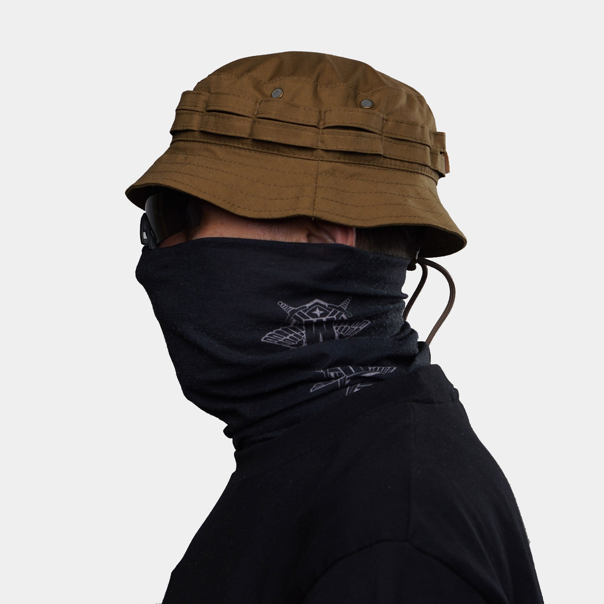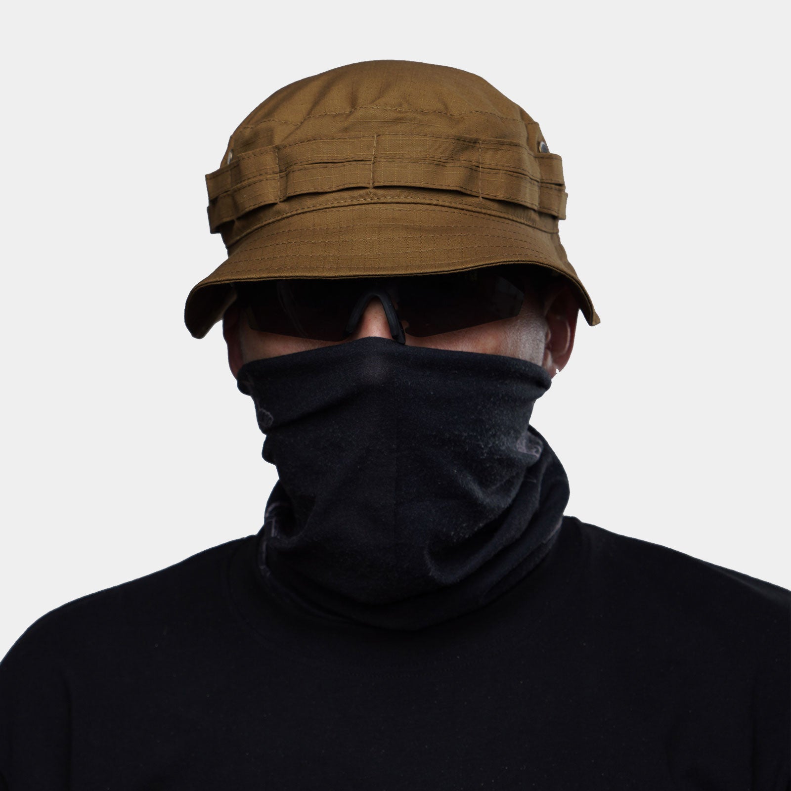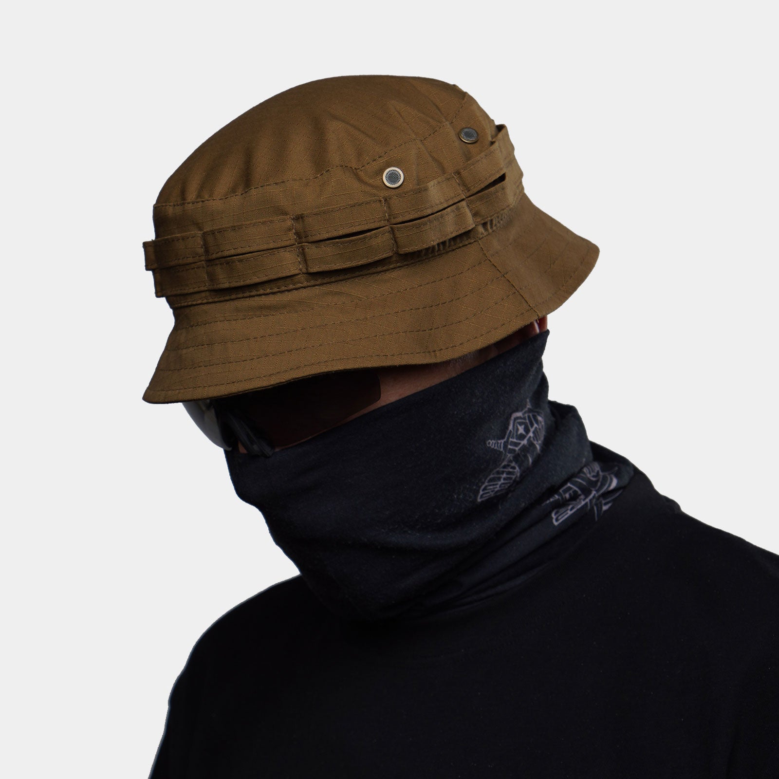 Panama hat from the UATAC brand with mowed fields in color Coyote Flexible. It has a cut with semi-rigid brims. The brim has a tape sewn around the perimeter, which is designed to attach additional camouflage equipment. It is equipped with a special cord that will not allow the panama hat to fly off the head during strong gusts of wind. It also has two built-in eyelets on each side, which provide excellent ventilation. The panama hat is sewn from durable and high-quality rip-stop fabric. All seams are hidden from the inside. This method of processing the seams makes the panama hat more comfortable during prolonged wear, and also increases its resistance to wear.