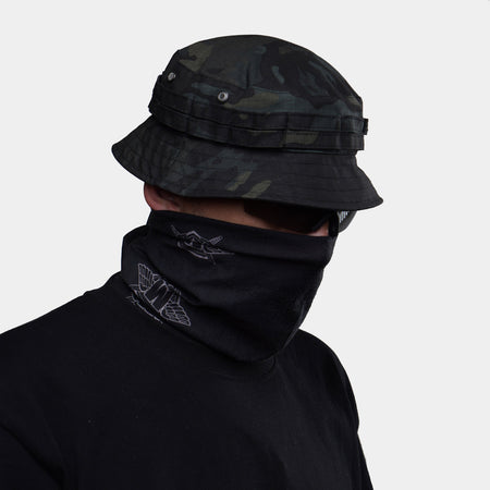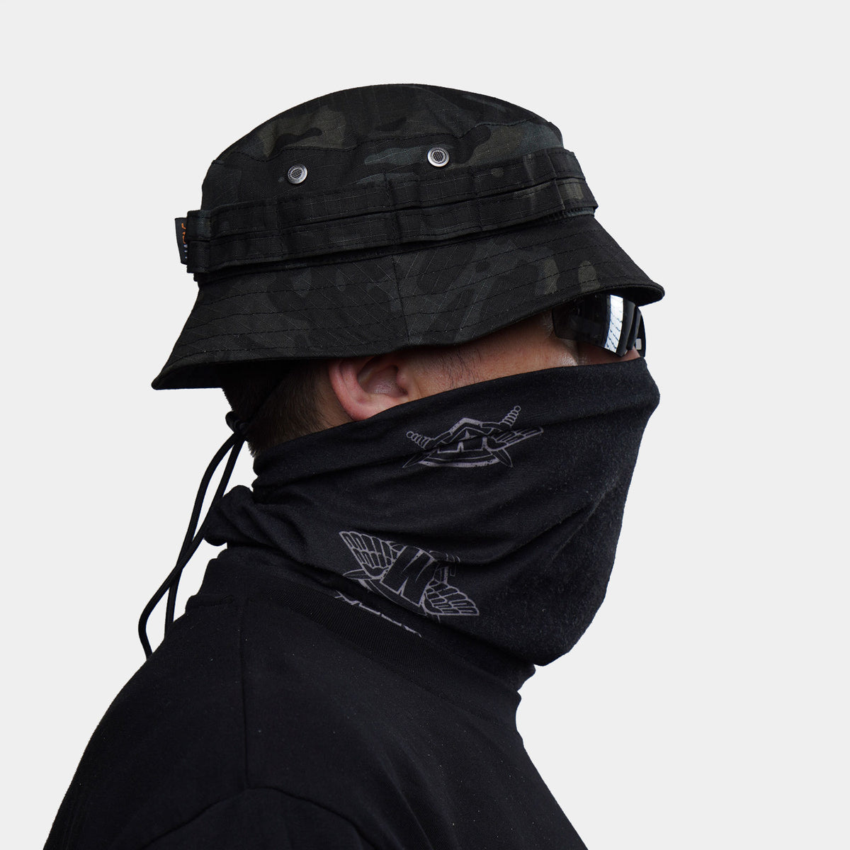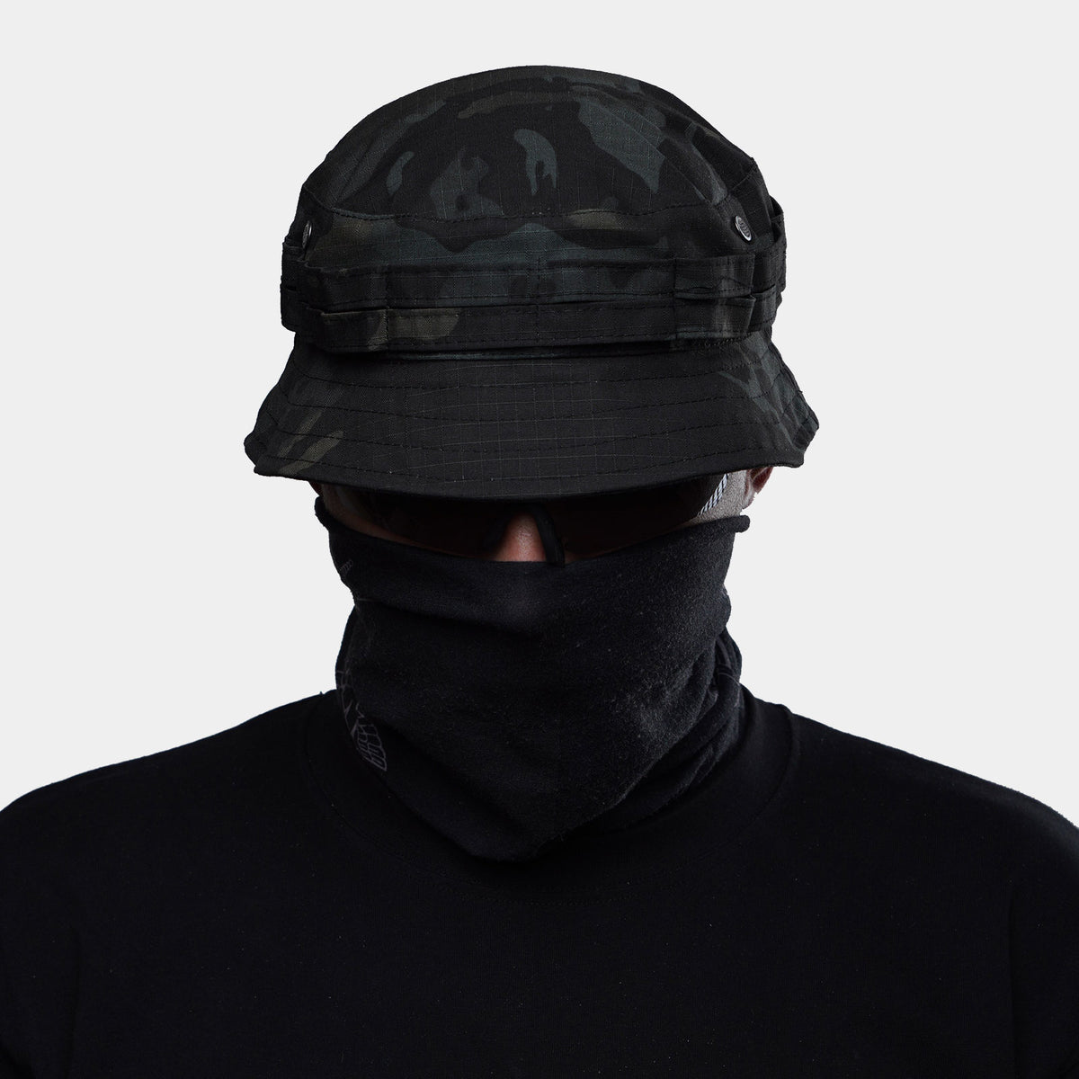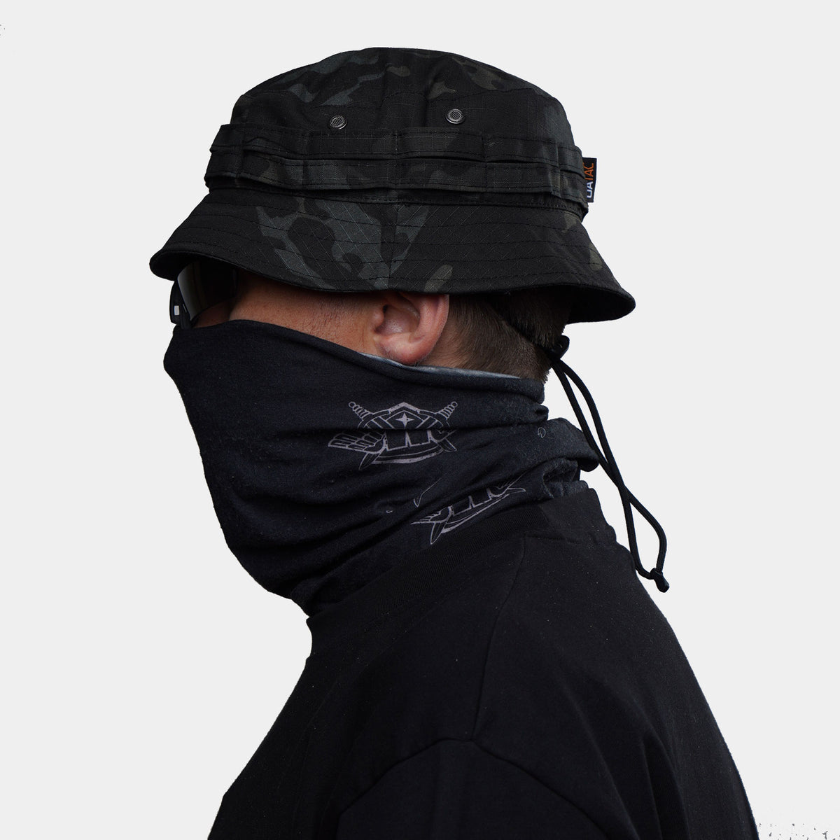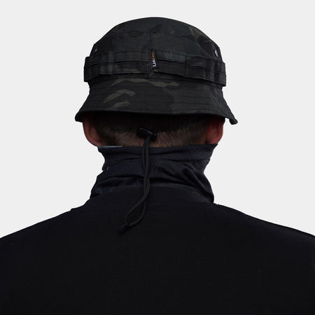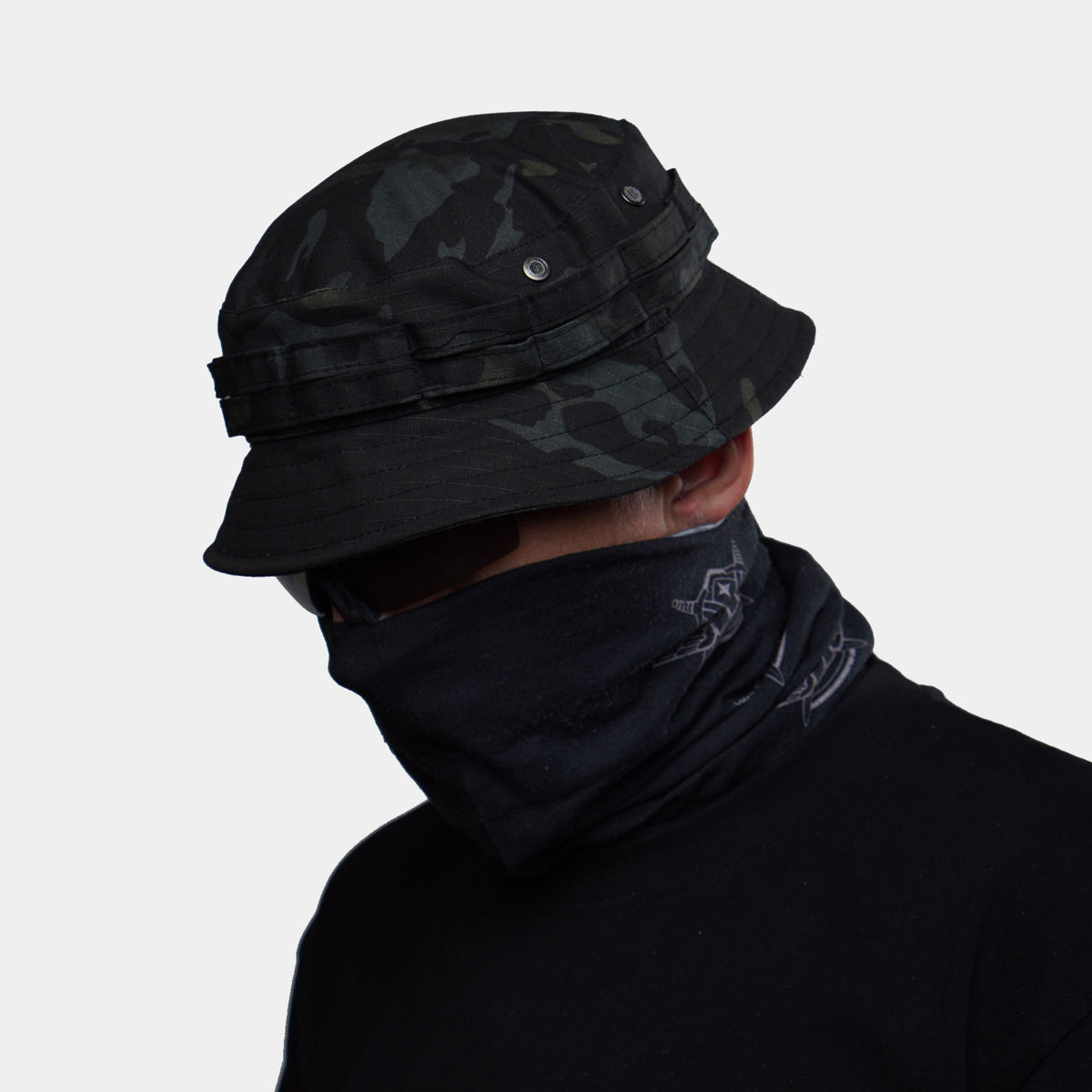 Panama hat from the UATAC brand with mowed fields in color Multicam Black. It has a cut with semi-rigid brims. The brim has a tape sewn around the perimeter, which is designed to attach additional camouflage equipment. It is equipped with a special cord that will not allow the panama hat to fly off the head during strong gusts of wind. It also has two built-in eyelets on each side, which provide excellent ventilation. The panama hat is sewn from durable and high-quality rip-stop fabric. All seams are hidden from the inside. This method of processing the seams makes the panama hat more comfortable during prolonged wear, and also increases its resistance to wear.