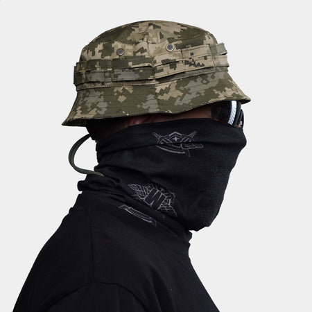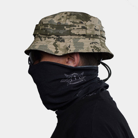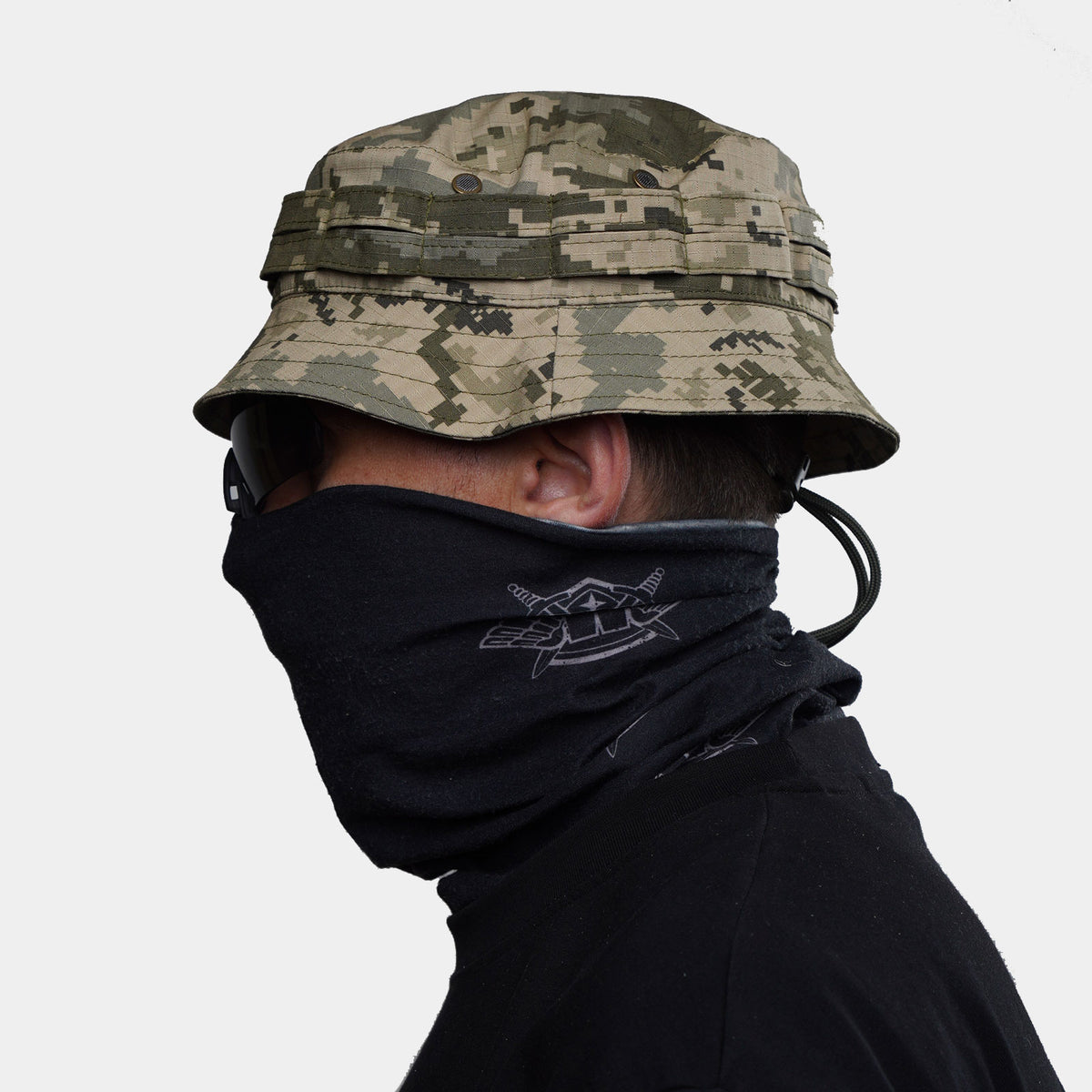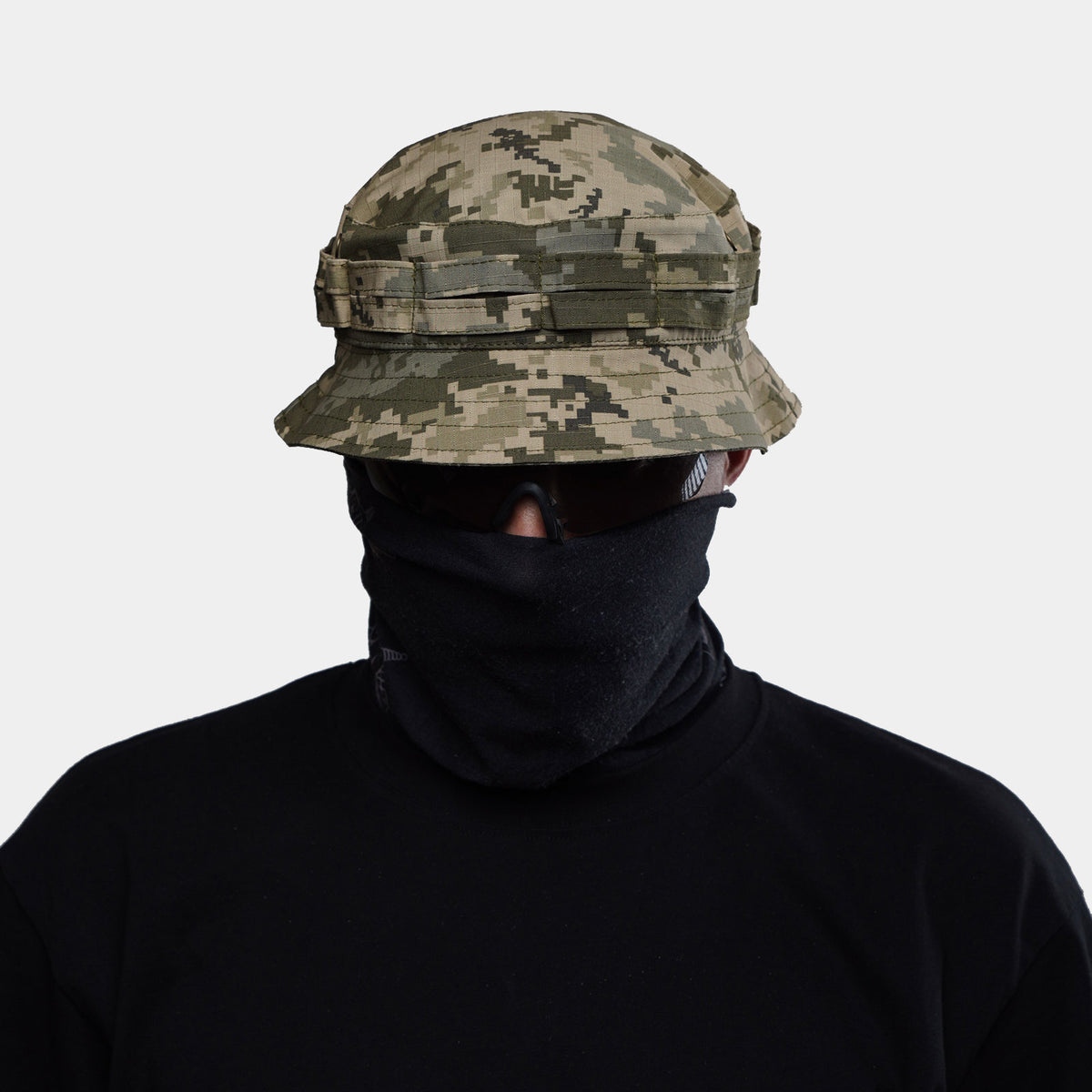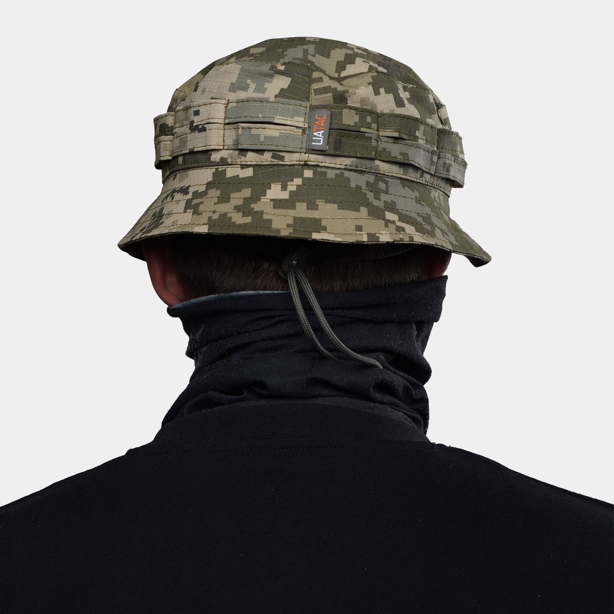 Panama hat from the UATAC brand with mowed fields in color Pixel Flexible. It has a cut with semi-rigid brims. The brim has a tape sewn around the perimeter, which is designed to attach additional camouflage equipment. It is equipped with a special cord that will not allow the panama hat to fly off the head during strong gusts of wind. It also has two built-in eyelets on each side, which provide excellent ventilation. The panama hat is sewn from durable and high-quality rip-stop fabric. All seams are hidden from the inside. This method of processing the seams makes the panama hat more comfortable during prolonged wear, and also increases its resistance to wear.