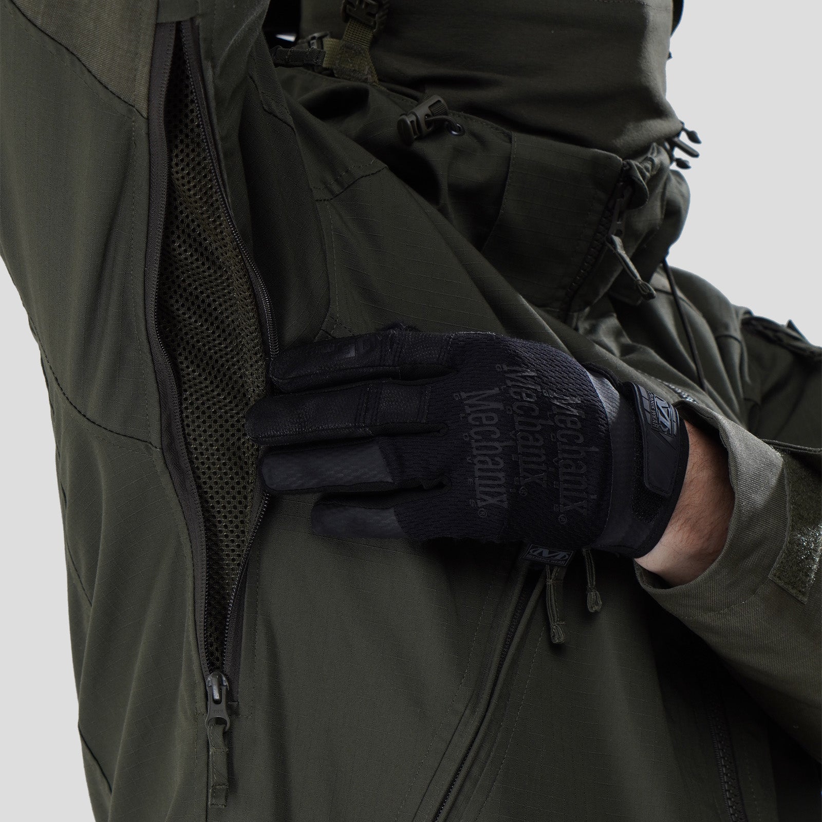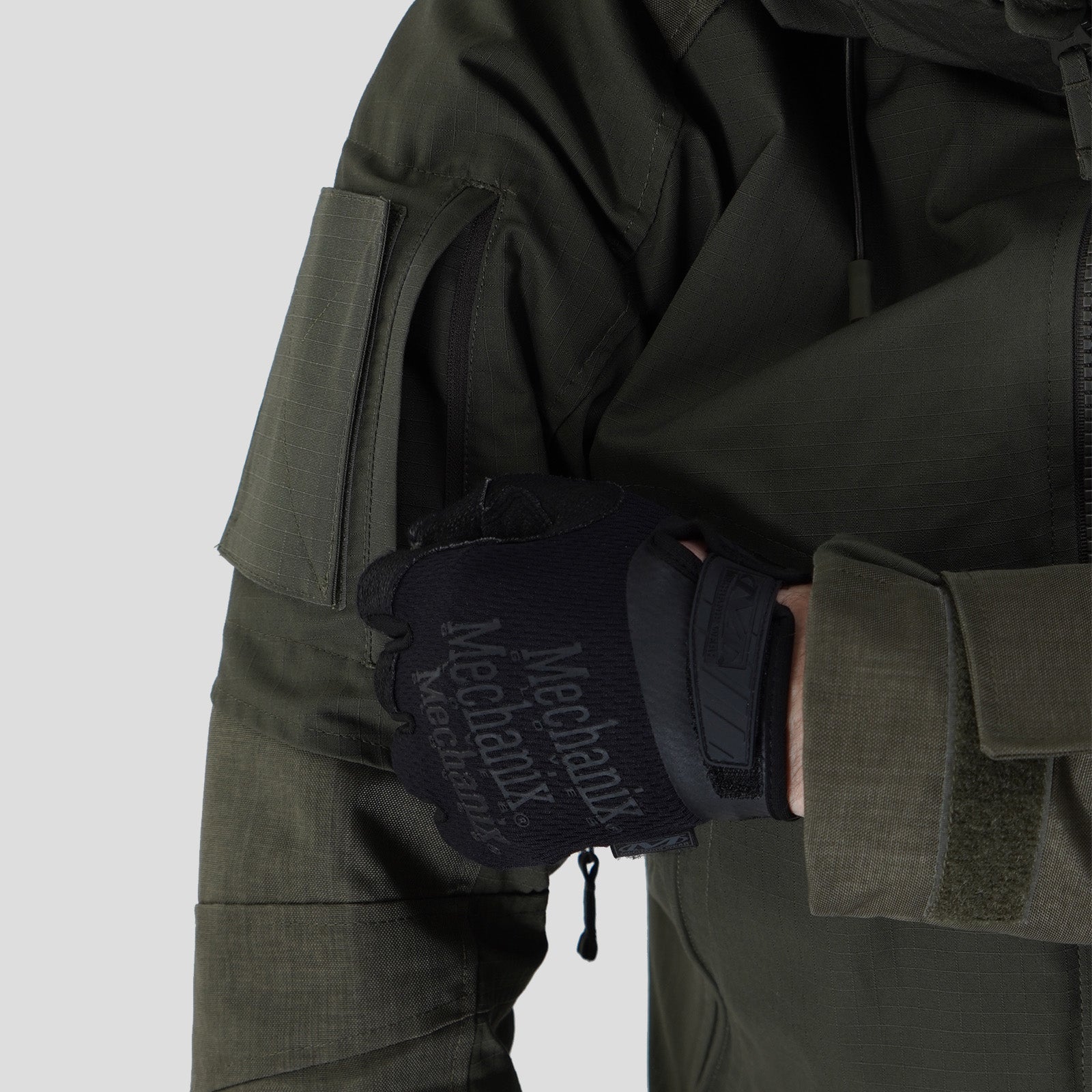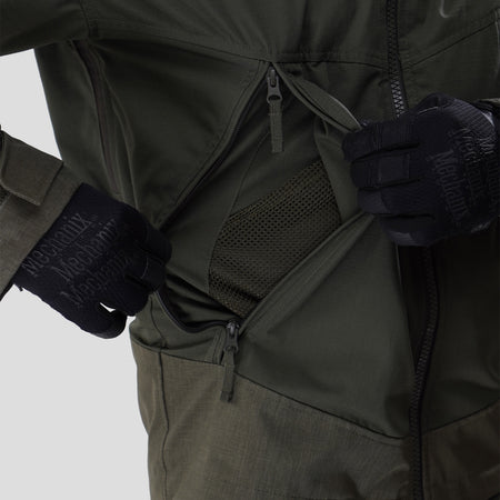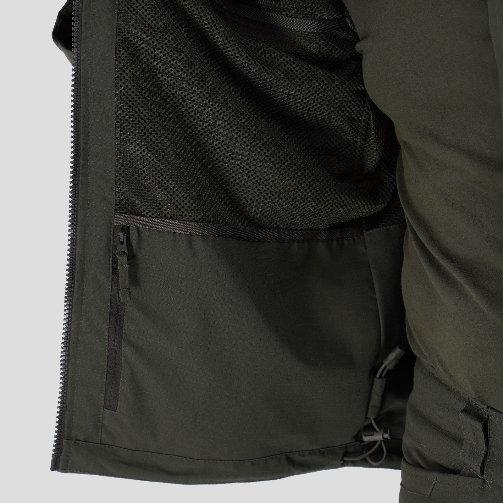 For active use in various conditions, the elbows, shoulders, waist and belt, which experience the greatest impact, are additionally reinforced with CORDURA® 500d Olive Brookwood® USA fabric, which provides greater resistance to abrasion and tearing and increases protection during operations. The jacket is maximally adapted for wearing a protective vest, gear harness and other equipment.