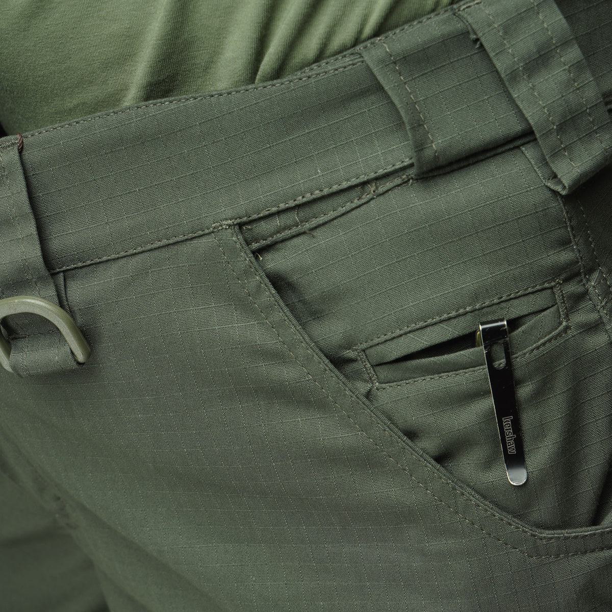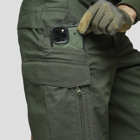 - 2 large cargo pockets, 2 front pockets with flashlight compartments, phone pocket on the right side, 2 back pockets