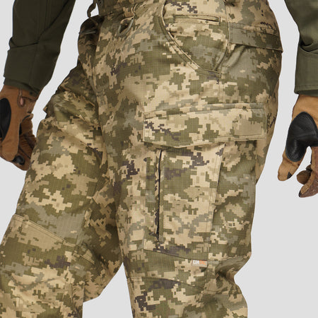The fabric consists of 65% cotton and 35% polyester, which makes it pleasant to the touch and resistant to tearing and damage. Ripstop weaving will prevent the pants from tearing even under heavy loads.