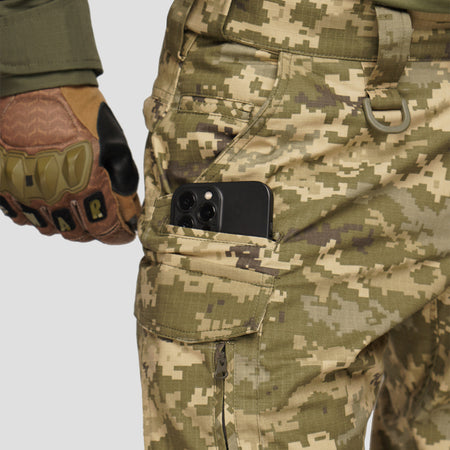 Special convenient phone pocket on the right side. Two front pockets for a flashlight. Large compartment in the knee area with the possibility of installing a knee pad inside (sold separately).