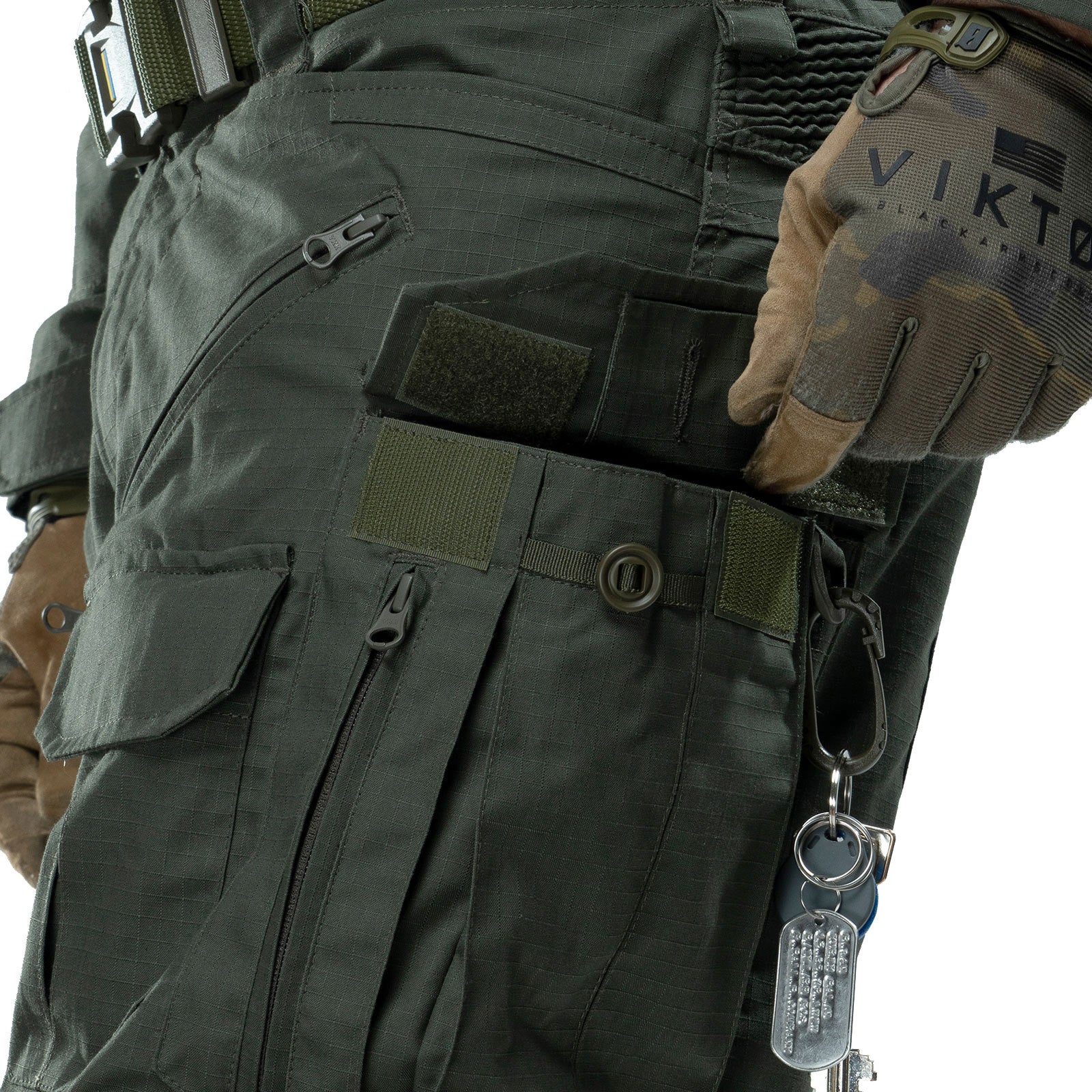 pükste eesosas kaks karabiini ja vasakus taskus